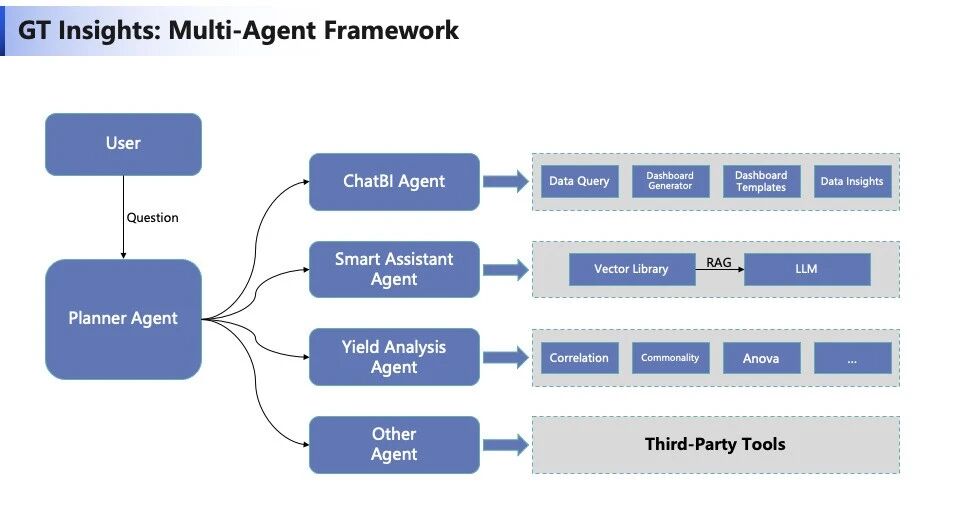 GT Insights的价值不止于单点能力的突破,更在于其作为恒行5CIM AI Foundation的重要组成部分,与它基于恒行5的Octopus AI Agent平台3.0开发,可通过AI Agent框架,与Planner Agent、Yield Analysis Agent等智能体“数字员工”协同工作。从被动响应走向主动规划分析路径、调用第三方工具(如SPC软件、良率分析插件),形成闭环的分析决策能力。