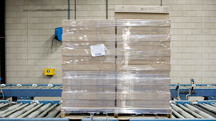 使栈板和箱子紧密捆绑一体并出货 将码垛好箱子的栈板进行整体水平打带,覆膜,竖直打带